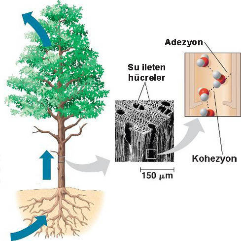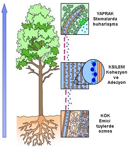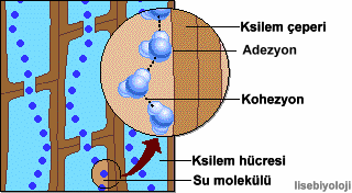 Odun borularının çaplarının dar olması ve çeper yüzeyi ile su molekülleri arasındaki çekim kuvveti (adezyon) de suyun yukarı taşınmasında etkilidir.