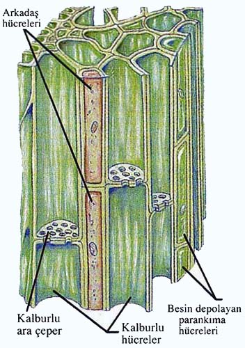 >Arkadaş hücreleri ise yoğun sitoplazmalı ve çekirdeklidir. Arkadaş hücreleri fotosentez ürünlerinin depolanması ve iletilmesi işlemlerinde kalburlu hücrelerle birlikte çalışır.
