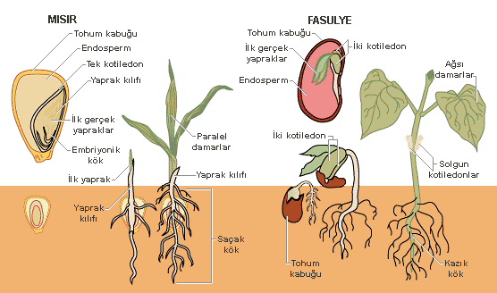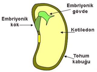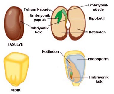 Tozlaşmadan sonra polendeki spermlerden birisinin yumurtayı dölleyerek oluşturduğu embriyon, embriyonik kök (kökçük), embriyonik gövde (gövdecik) ve çenekler (kotiledon)den oluşur.
