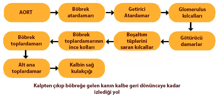 vBöbreklere kan, sağ ve sol böbrek atardamarlarıyla girer, sağ ve sol böbrek toplar damarlarıyla çıkar.