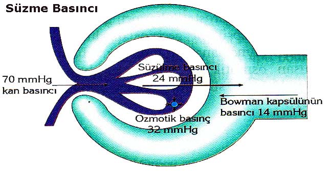 Glomerulustan Bowman kapsülüne, kan plazmasının bir kısmı (kan proteinleri ve kan hücreleri “alyuvar-akyuvar-trombosit” hariç), su, tuzlar, glikoz, aminoasit, üre, ürik asit, vitamin, kreatinin gibi maddeler geçer. Böbreği geçen aort kılcalları (getirici) Bowman kapsüllerinin çanağında glomerulusu meydana getirdikten sonra, kapsülden çıkıp (götürücü) proksimal tüp, henle kıvrımı ve distal tüp üzerinden yayılır.