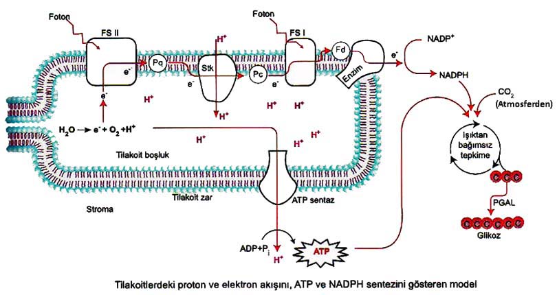 Elektronların tilakoit zarda bulunan ETS’den geçişi stromadaki protonların (H+) tilakoit boşluğa pompalanmasını sağlar. Aynı zamanda tilakoit boşlukta suyun ayrışmasıyla da protonlar oluşur.
