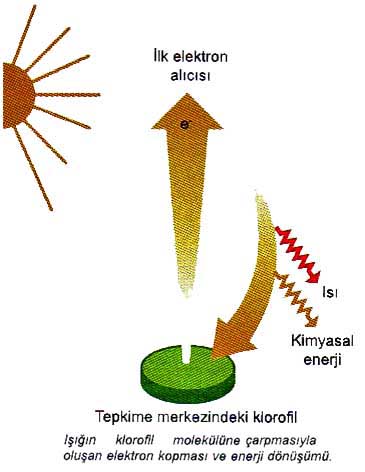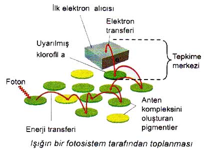 Bu fotosistemlerin tepkime merkezlerinde birbirinin aynı olan klorofil a molekülleri bulunur. FS I ve FS II’deki klorofil a molekülleri farklı proteinlerle birleştiğinden ışık emme özelliklerinde farklılık vardır. FS I’in tepkime merkezindeki klorofil, P700 olarak isimlendirilir. Çünkü bu pigment 700 nm dalga boyundaki ışığı en iyi soğurur. FS II’nin tepkime merkezindeki klorofil ise 680 nm dalga boyundaki ışığı en iyi soğurduğu için P680 olarak isimlendirilir. Bir foton, bir pigment molekülüne çarptığında enerji tepkime merkezine ulaşıncaya kadar bir molekülden diğerine geçer. Tepkime merkezindeki klorofilden ayrılan uyarılmış bir elektron, özelleşmiş bir molekül tarafından yakalanır. Bu molekül ilk elektron alıcısı olarak isimlendirilir. Elektron aktarımı enerji dönüşümlerinin başlangıcıdır.