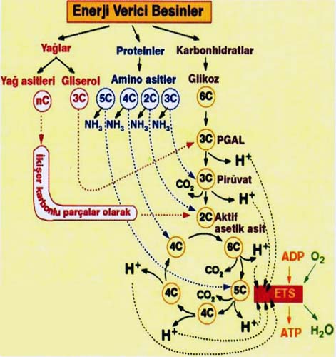 Organizmaların kullandıkları besin maddeleri karbonhidratlar, yağlar ve proteinlerdir. Bu moleküllerin tümü gerektiğinde enerji kaynağı olarak kullanılabilir. Bu maddeler çoğunlukla asetil CoA’ya dönüştürülerek kullanılır.