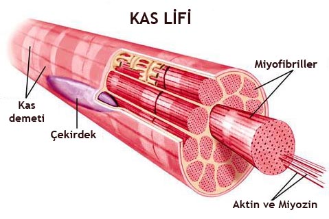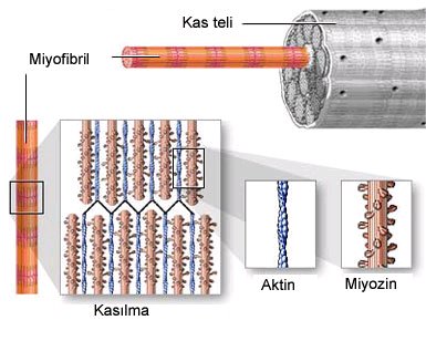ðMiyofibriller aktin ve miyozin denilen kas proteinleridir. Aktin proteini ince iplikleri, miyozin ise kalın iplikleri oluşturur.