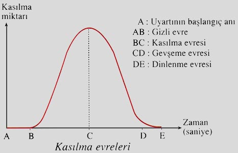 Belirli bir şiddete sahip uyaran ile uyarılan bir kasın kasılıp gevşemesi dört evrede gerçekleşir: