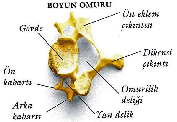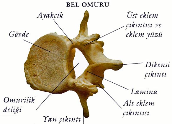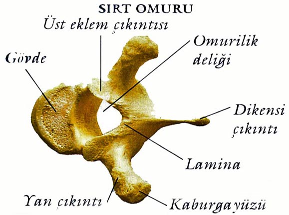 >Her omurda iki yan çıkıntı, bir dikensi çıkıntı, omur cismi, omur deliği, omur yayları ve eklem çıkıntıları vardır.