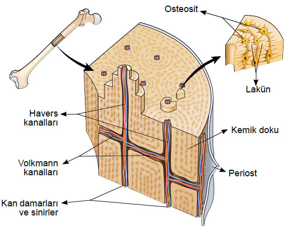 vSıkı kemik dokusunda havers kanallarını birbirine, kemiğin dışına ve kemik iliğine bağlayan enine kanallara volkman kanalları denir.Sinirler ve kan damarları volkman kanallarından geçer.
