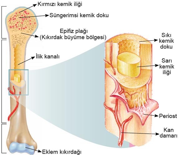 vUzun kemiklerin gövdesindeki boşlukta ise sarı ilik bulunur.