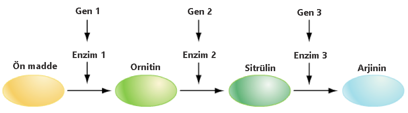 Örneğin, gen2 mutasyona uğrarsa, enzim2 yapılamadığı için, ornitin sitrüline dönüştürülemez. Ortamda ornitin birikir. Biriken bu ve benzeri maddeler hücrenin veya canlının ölümüne bile sebep olabilir. Sonuçta oluşması gereken madde canlı için hayatsal öneme sahipse yine canlı ölebilir. Reaksiyonun devam etmesi için yapılamayan maddeyi (bu örnekte sitrülini) ortama hazır vermek gerekir. Bu tür mutasyonlar insanlar ve diğer canlılarda görülmekte olup, öldürücü sonuçlar bile ortaya çıkabilmektedir.