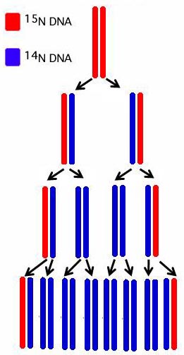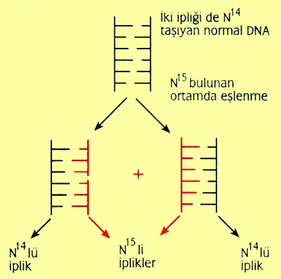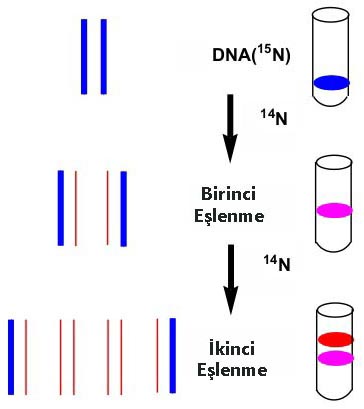 Yeni oluşan bakterilerin DNA’ları incelendiğinde de her birinin bir ipliğinde normal azot (N14), diğer ipliğinde sadece ağır azot (N15) bulunduğu görülmüş.