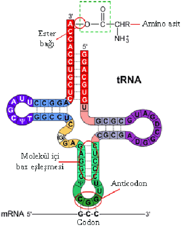 tRNA’ların şekli üç yapraklı yoncaya benzer. Bir ucuna amino asit bağlanır. Diğer ucunda ise mRNA ile uyum sağlayacak üçlü nükleotid dizisi antikodon vardır.