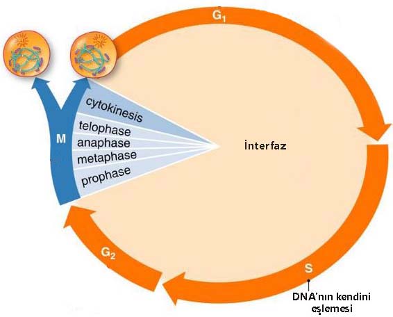 Bölünmeye devam eden hücrelerde ise interfazdan sonra mitotik faz (karyokinez ve sitokinez) ile hücre döngüsü tamamlanır.