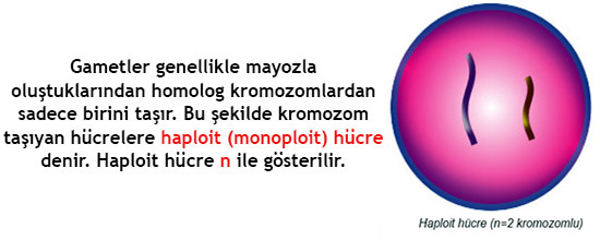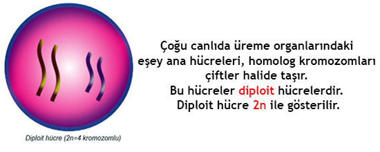 NOT: Mayoz öncesinde hücrede bir kez DNA kendini eşler. Mayozda çift bölünme olur. İlk bölünmede homolog kromozomların birbirinden ayrılmasıyla kromozom sayısı yarıya iner.