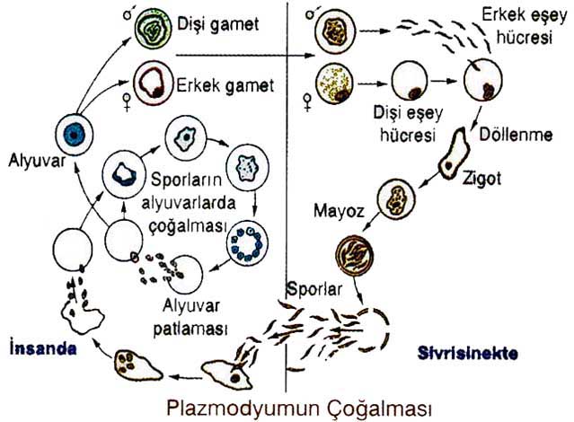 Sıtma mikrobu olan plazmodyum üremesini anofel cinsi dişi sivrisinekte eşeyli, insanda alyuvarlar içinde eşeysiz, sporlanarak tamamlar.