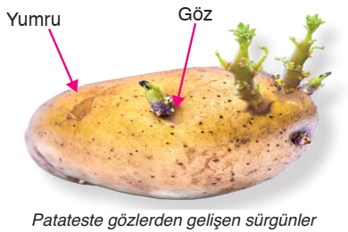 Patates ve yer elması gibi bitkilerin yumru gövdeleri üzerindeki gözlerden gelişen sürgünler, yeni bitkileri oluşturur.