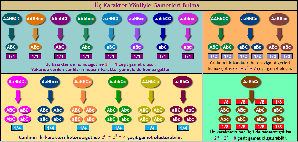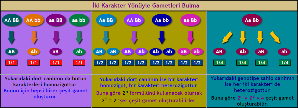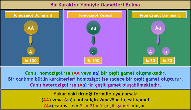 >Homozigot canlılar tek çeşit, heterozigot canlılar ise iki çeşit gamet oluştururlar.