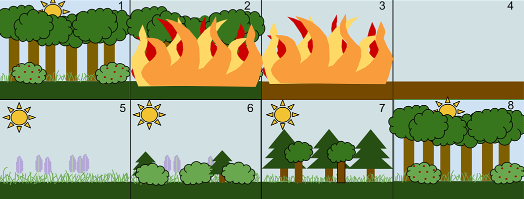 Çalı – Funda: Otsu bitkiler rekabeti kaybeder. Ortama böğürtlen, ardıç gibi küçük ağaçlar yerleşir. Hayvanlar aracılığıyla büyük ağaçların tohumları ortama taşınır.