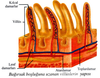 lEmilme yüzeyini büyütmek için bağırsak boyu uzatılmış ve bağırsak iç yüzeyini örten epitelin kıvrımlarıyla (Villüs) yüzey oldukça arttırılmıştır.