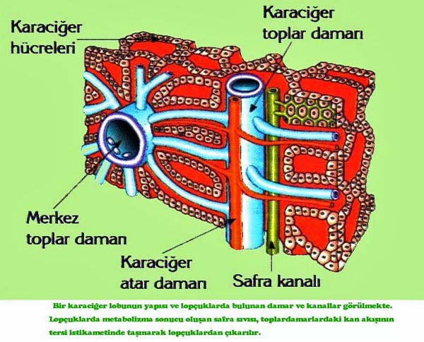 sLopçuğun merkezi boyunca uzanan damara merkez toplardamar (lop içi toplardamar) denir. Lopçuğun çevresinde ise loplar arası toplardamar, loplar arası safra kanalı ve karaciğer atardamarının kolları bulunur. Karaciğer hücreleri, lopçuğun merkezinden çevresine doğru şeritler halinde dizilmiştir.