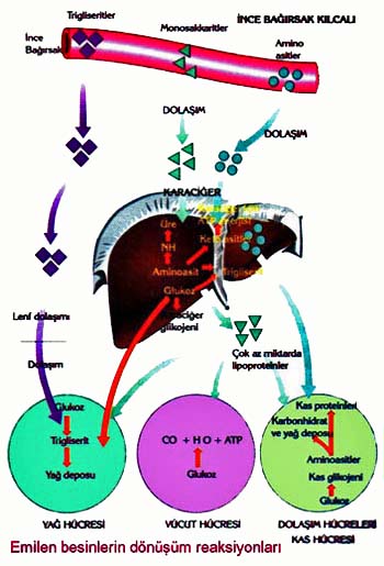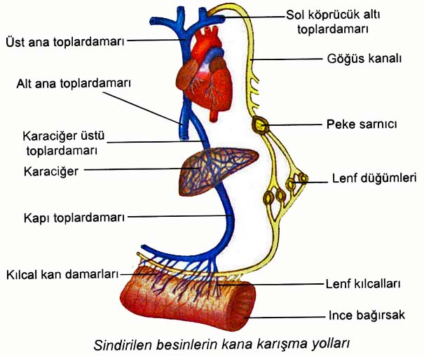 Sindirilen besinlerden glikoz, fruktoz, aminoasitler ile suda çözünen vitaminler, su ve madensel tuzlar, aşağıdaki yolu izleyerek vücuttaki hücrelere ulaşır.