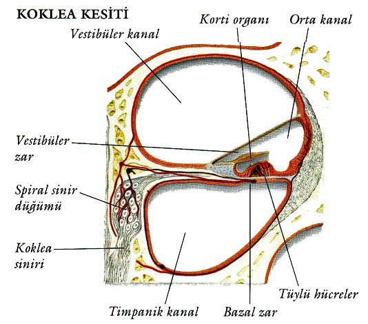 Kohlear kanal: Vestibular kanal ile Timpanik kanal arasındadır.İçi endolenf denilen sıvı ile doludur. Esas işitmeyi sağlayan korti organı bu kanalda bulunur.