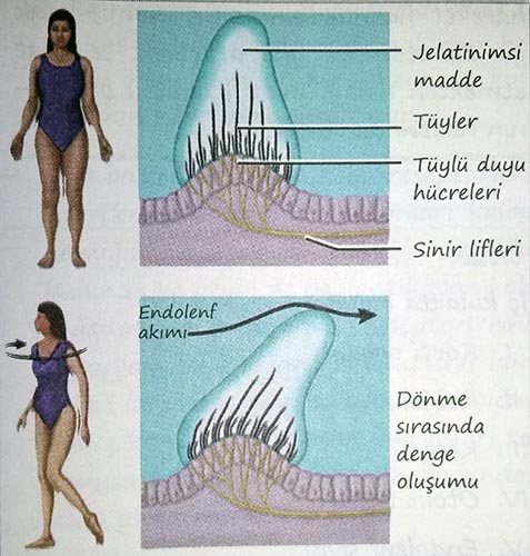 Vücudun herhangi bir yöne dönmesi ile birlikte yarım daire kanalları da döner. Fakat içinde bulunan endolenf eylemsizliği nedeniyle ters yönde hareket eder. Vücut pozisyonuna göre kulak taşlarının duyu hücrelerine yaptığı basınç değişir. Bu durum impuls oluşumuna neden olur. İmpulslar beyne ve beyincik merkezine iletilir ve merkezden gelen emirle denge sağlanır.Dengenin sağlanmasında gözden, kaslardaki özelleşmiş reseptörlerden, ayak altında basınca duyarlı hücrelerden gelen impulslar da etkilidir.
