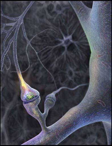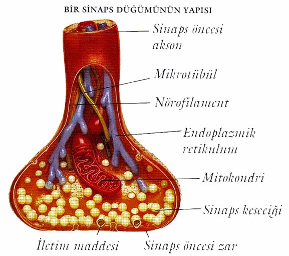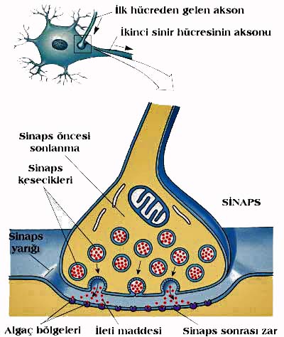 Sinapstan gelen uyartı, sinapstaki keseleri patlatır. Sinaps keseleri patlayınca, içlerindeki sinir uyarısı taşıyan (nörotransmitter) maddeler, sinaps boşluğuna dökülerek diğer nöronun dendritinde yeni bir uyartı oluşturur.