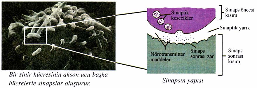 Sinir hücreleri birbirleri ile ilişki kurarak vücut ile merkezi sinir sistemi arasında impuls iletimi yaparlar. Bir nöronun akson ucu ile diğer bir nöronun dendriti arasıda sinaps denilen bağlantı bölgeleri bulunur. Akson ucuna sinaptik yumru denir ve bol miktarda mitokondri ile sinaptik keseler kapsar. Bu keseler içinde asetil kolin, noradrenalin, dopamin, seratonin ve histamin gibi maddeler vardır. Bu maddelere nörotransmitter maddeler denir. Bu maddeler sinirsel geçişi sağlar.